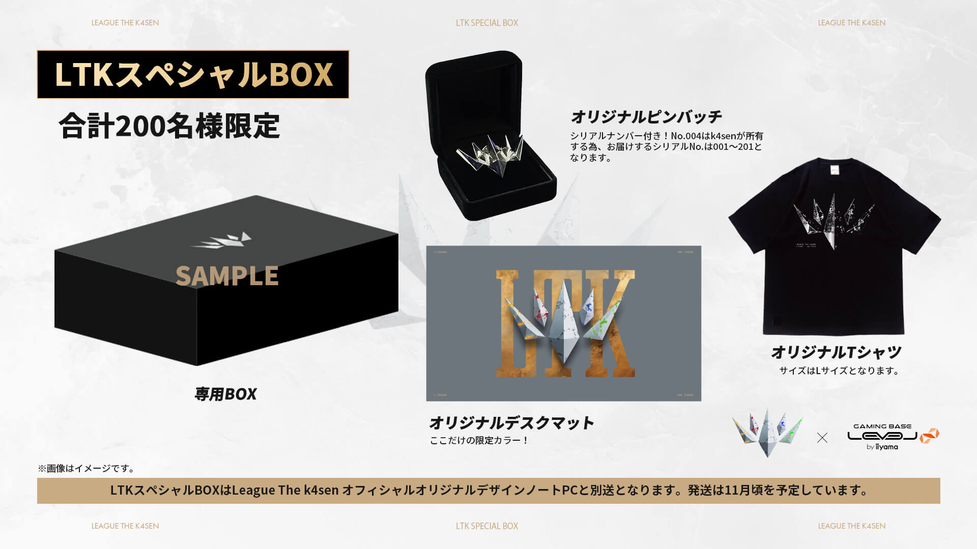 League The k4sen オフィシャルオリジナルデザインノートの発売を記念して、k4sen厳選のオリジナルアイテムが詰まった「LTKスペシャルBOX」がセットになった数量限定モデルを抽選販売いたします。「LTKスペシャルBOX」は、細部の装飾にもこだわり抜いた結果、200個のみのご用意でシリアルナンバー入り。もちろんk4senも皆様とともに所有いたします。