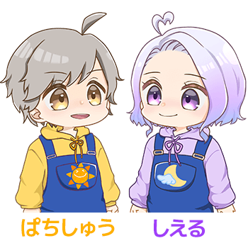 ぱちしゅう 7/12生まれ。いつも真面目で困った友達を助ける優しい男の子。 しえる 9/5 生まれ。少し抜けていることもあるけど、建築と発明が得意。泣き虫だけどとてもやさしい女の子。