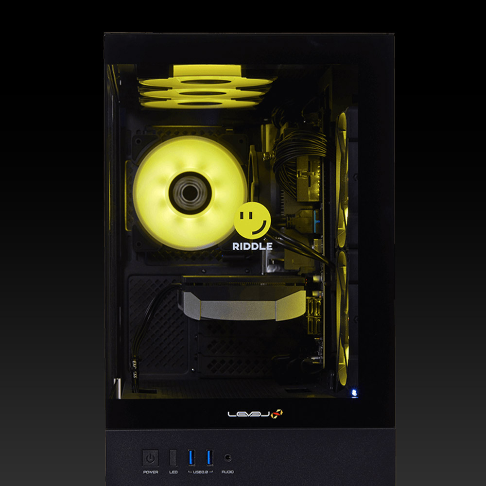 前面の水冷システム内側に最大3基、天面と背面に3基、最大6基のLEDファンを搭載。上質なLEDライティングとRIDDLE ORDERのオリジナルデザインが楽しめる左側面のオリジナルガラスパネル。