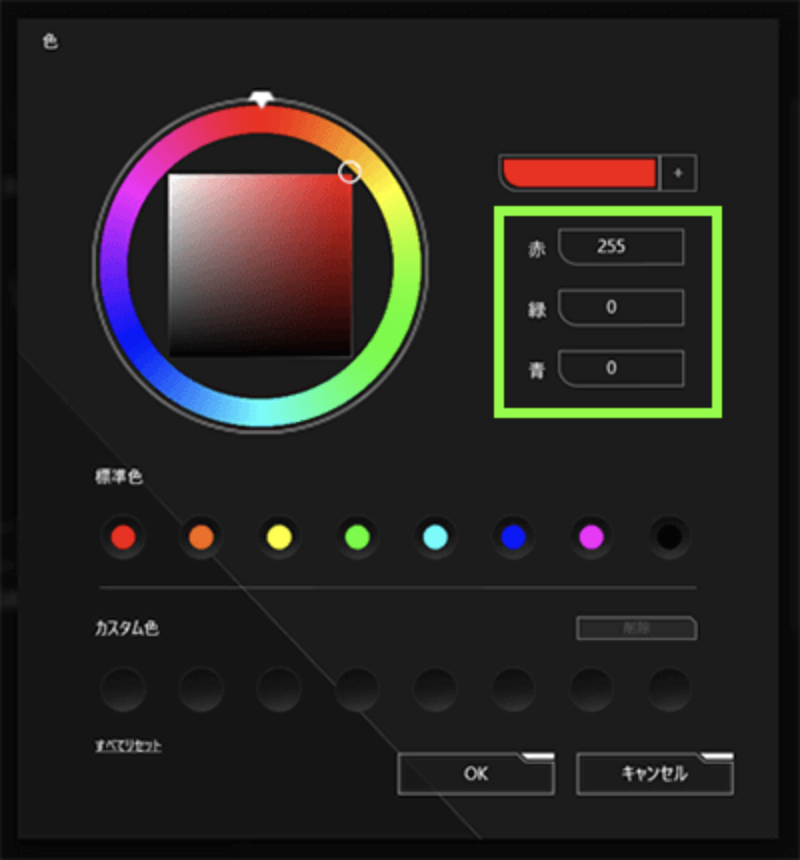 赤緑青の設定値については、コラボモデル専用ダウンロードページからダウンロードいただける、RGB設定ファイルの説明テキストをご参照ください。