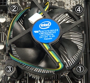 プッシュピンを押す順番です。対角線上に①~④の順に押していきましょう。 ピンが固定されているのを確認するには、マザーボード裏面を見て黒いピンが出て入れば成功です。