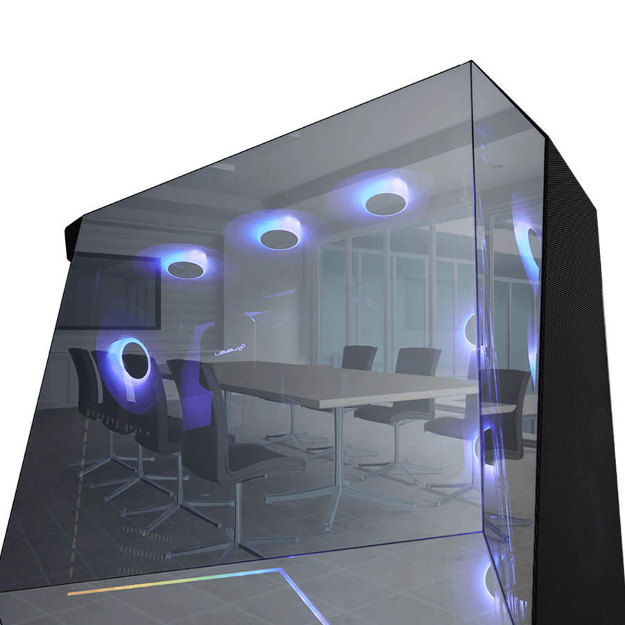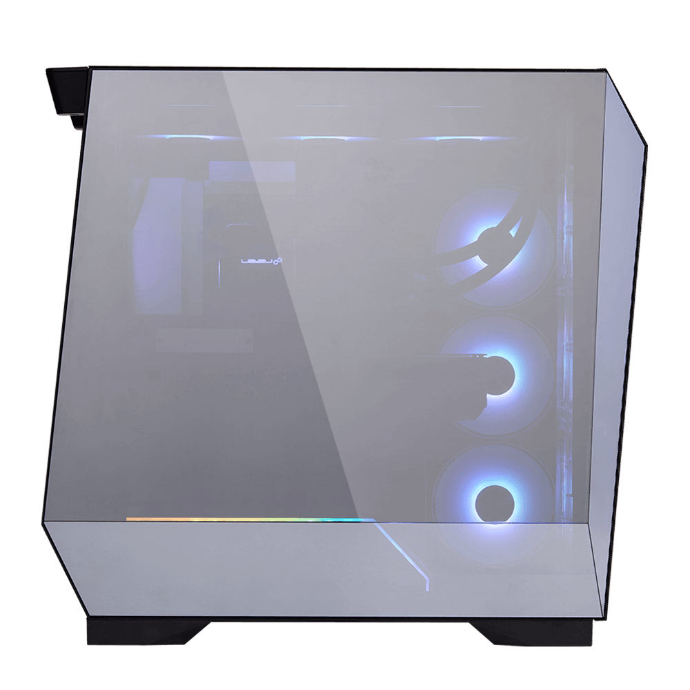 RGB LED イルミネーションファンがハーフミラーガラスパネル越しに鮮やかに輝き、電源オンで内部が幻想的に浮かび上がる演出を実現。