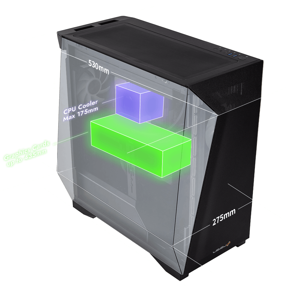 ケース内部は、最大360mmサイズの水冷CPUクーラーや、高さ175mmまでの空冷CPUクーラーに対応しており、高性能CPUとの柔軟な組み合わせが可能です。