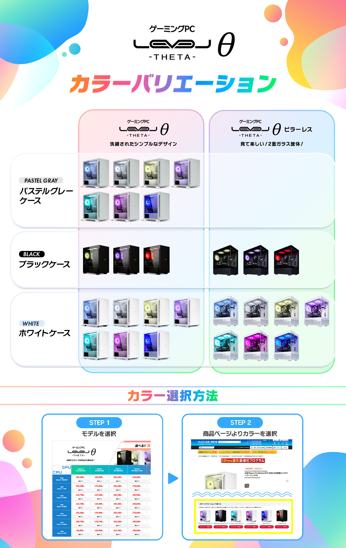 ミニタワーモデル「LEVELθ(レベル シータ)」では人気の高いパステルグレーとブラックとホワイトの3色のケースをご選択いただけます。強化ガラス仕様のサイドパネルが採用されており、ライトアップされたPCが部屋をより引き立て、気分を盛り上げてくれること間違いなしです!