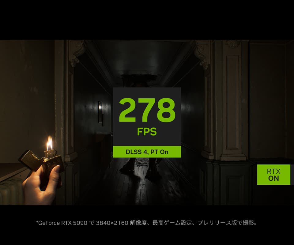 GeForce RTX 50 シリーズはマルチフレーム生成を備えた DLSS 4 により、FPS の向上、遅延の低減、画質の向上が実現し、『バイオハザード レクイエム』のゲーミング体験が強化されます。