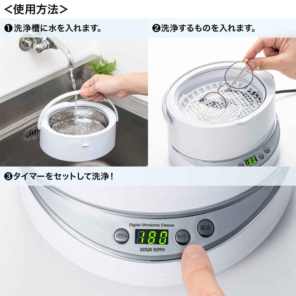 ※洗浄槽に水を入れてから使用してください。空焚き状態になると、過熱により火傷や故障の原因となります。