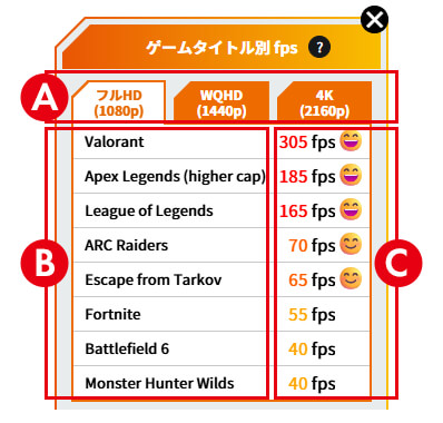 - ゲームタイトル別に、掲載モデルのスペックにおいて3DMARK社のデータより予測される fps(フレーム・パー・セカンド:1秒あたりの画面描画回数)が表示されます。フレームレートとも呼ばれ、数値が大きいほど、より滑らかな画面表示となり、パソコンの性能が高いことを示します。