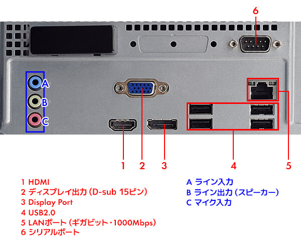 - アナログ6ch(ライン出力×1/ライン入力×1/マイク入力×1) ,USB 2.0×4 ,1000BASE-T LANポート×1 ,ディスプレイ出力(HDMI×1/DisplayPort×1/miniD-sub15Pin×1)