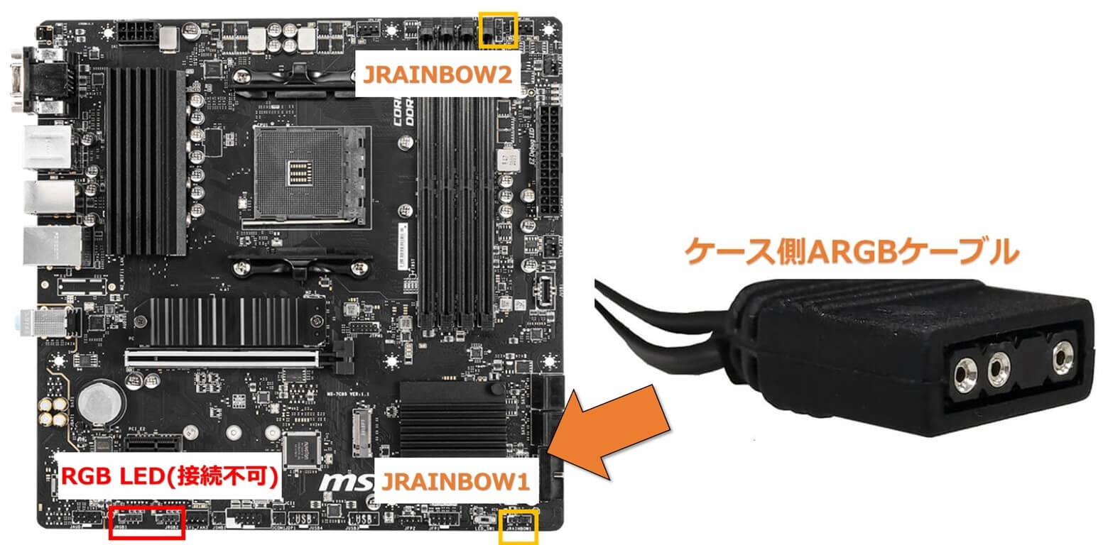 ・PCケース側のARGBケーブルをマザーボードに接続する際は「JRAINBOW1」端子に接続してください。