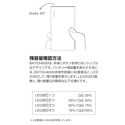 バッテリー本体を前後に60度振ると、青色LEDの点灯数でバッテリーの残り容量を教えてくれます。