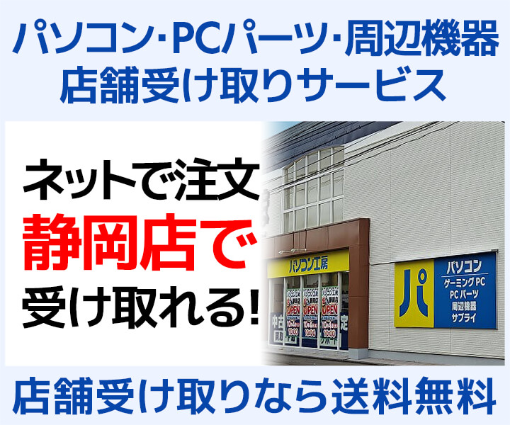 パソコン工房 静岡店では、WEB通販サイトで購入したパソコン・PCパーツ・周辺機器を店頭で送料無料で受け取れる、『店舗受け取りサービス』をご利用いただけます!お買い上げいただいたパソコン・PCパーツ・周辺機器の活用法など、直接店舗スタッフにアドバイスを受けられます。 また「店舗に行ったついでにパソコンも見ておきたい」そんなご要望にも、専門のスタッフが用途に合わせた最適な商品をご提案いたします。
