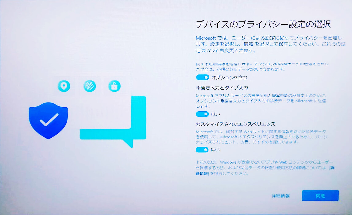 パソコンを初めて起動した時や、リカバリーをした場合、画面に表示される内容に従ってWindowsの初期設定を行います。