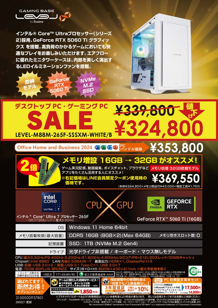 GeForce RTX 5060 Ti搭載! ゲーミングパソコンLEVEL-M88M-265F-SSSXM-WHITE