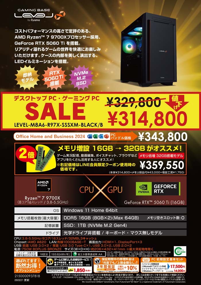 Ryzen™ 7 9700Xプロセッサー採用、GeForce RTX 5060 Ti搭載。当店人気のスペック!