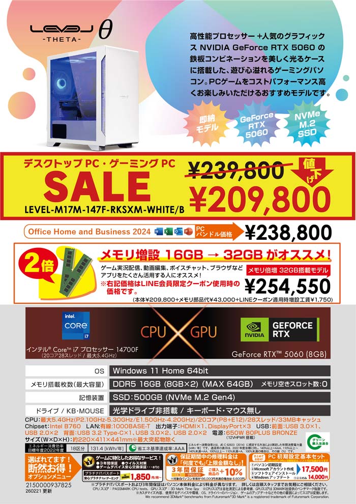 GeForce RTX 5060搭載! ゲーミングパソコンLEVEL-M17M-147F-RKSXM-WHITE