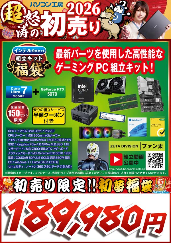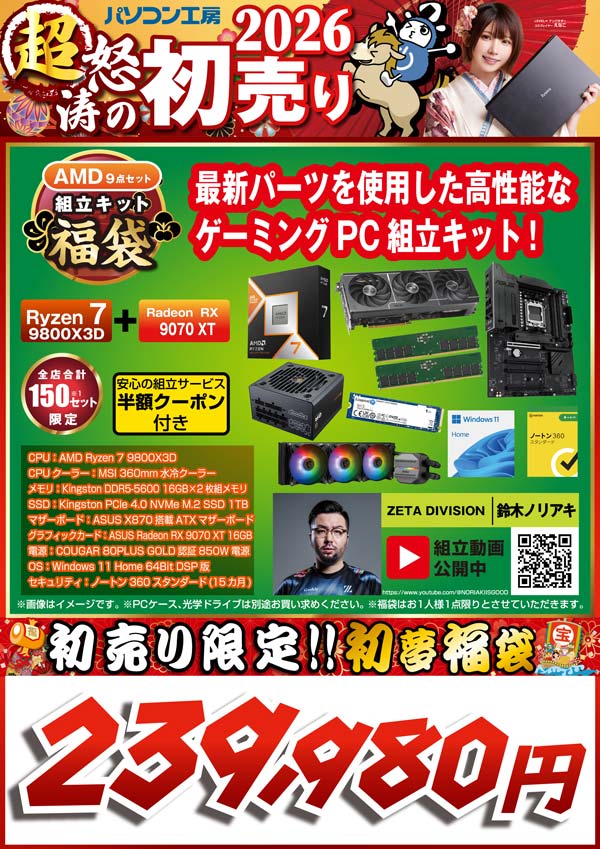 【パソコン工房 秋葉原パーツ館】では、新春初売りチラシに掲載の対象商品「初夢福袋(組立キット)」、「PCパーツ」、「モニター」を事前のWEB抽選にて販売いたします。 詳しくはこちらをご確認ください。