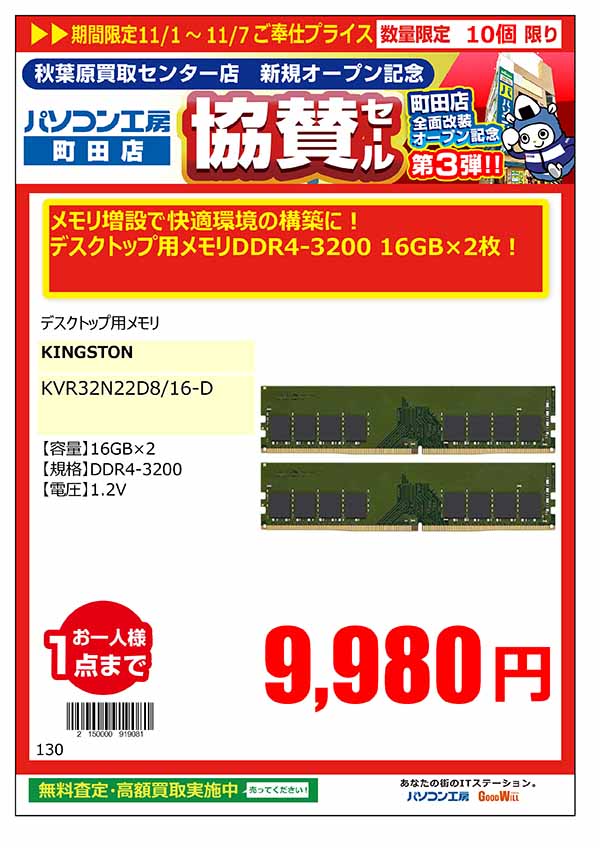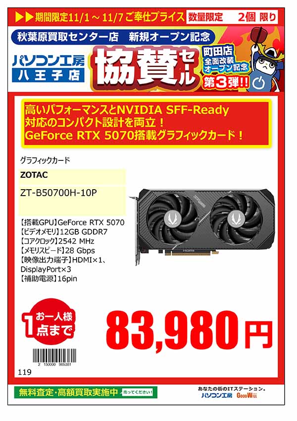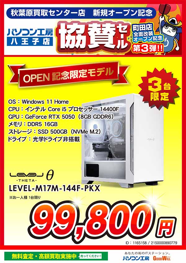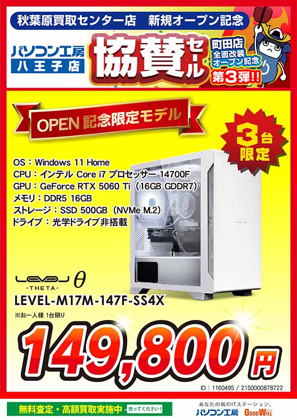 「パソコン工房 秋葉原買取センター」のオープンを記念して、「新規オープン記念セール」と同日より、「パソコン工房 町田店」「パソコン工房 八王子店」で、「新規オープン記念 協賛セール」を開催いたします。