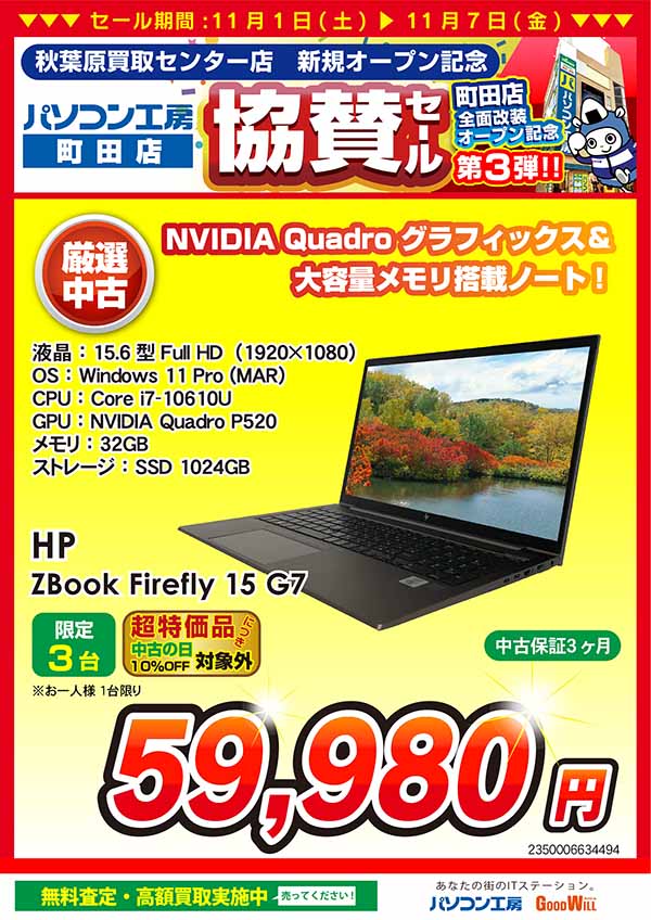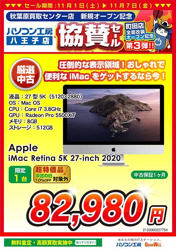 「パソコン工房 秋葉原買取センター」または「パソコン工房 町田店」「パソコン工房 八王子店」で当社指定商品をお売りいただくと、最大 5,000円分相当の「当社商品券」を 11/1(土)より還元いたします!