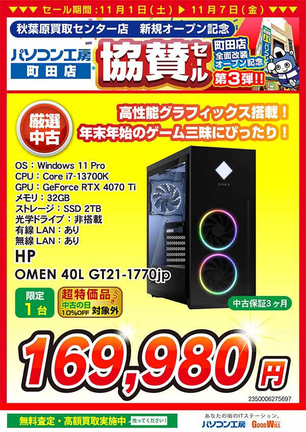 | 対象店舗 | ・パソコン工房 秋葉原本店 ・パソコン工房 秋葉原パーツ館 ・パソコン工房 町田店 ・パソコン工房 八王子店 ・パソコンSHOP アーク |