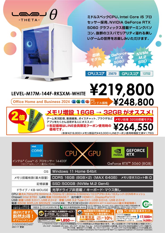 GeForce RTX 5060搭載! ゲーミングパソコンLEVEL-M17M-144F-RKSXM-WHITE